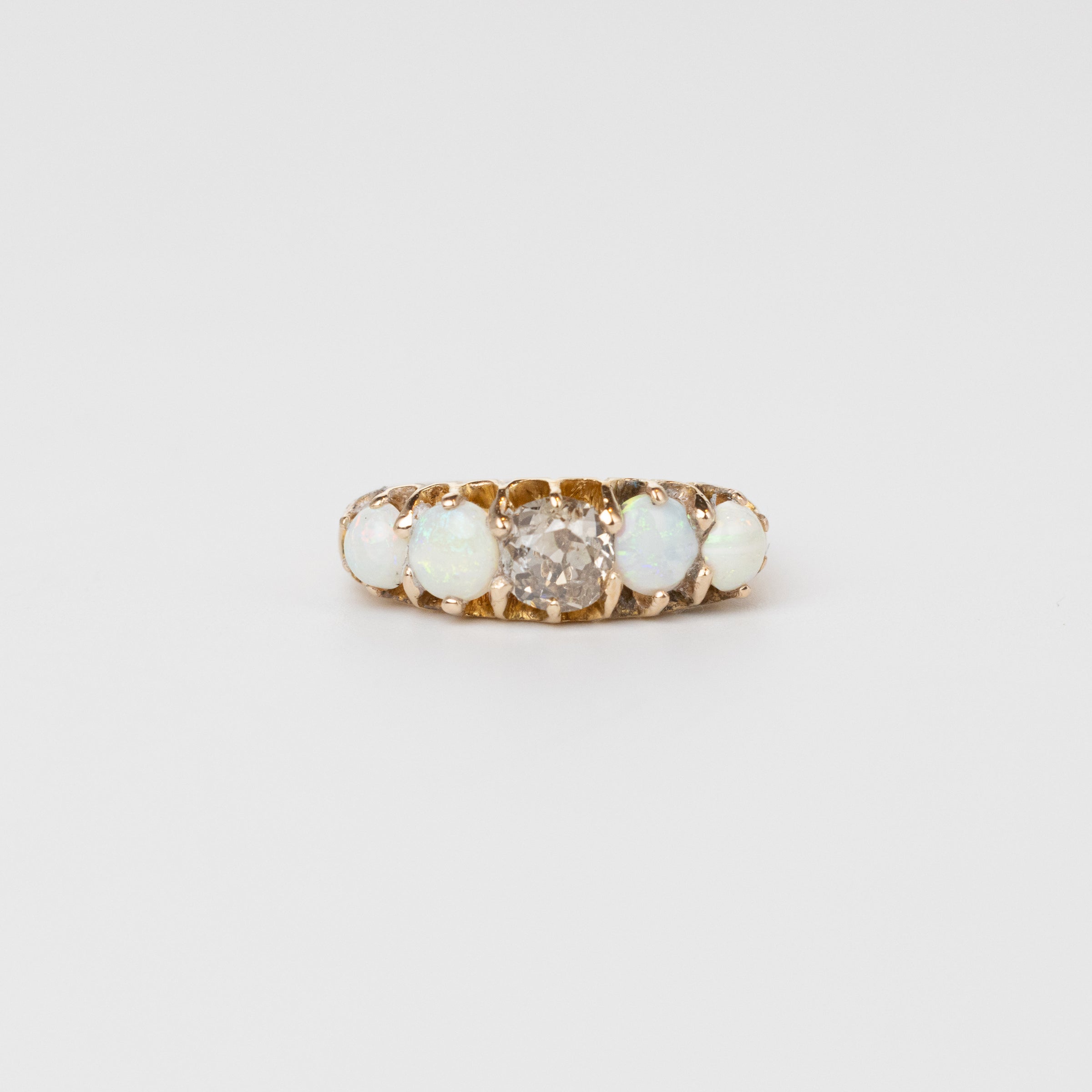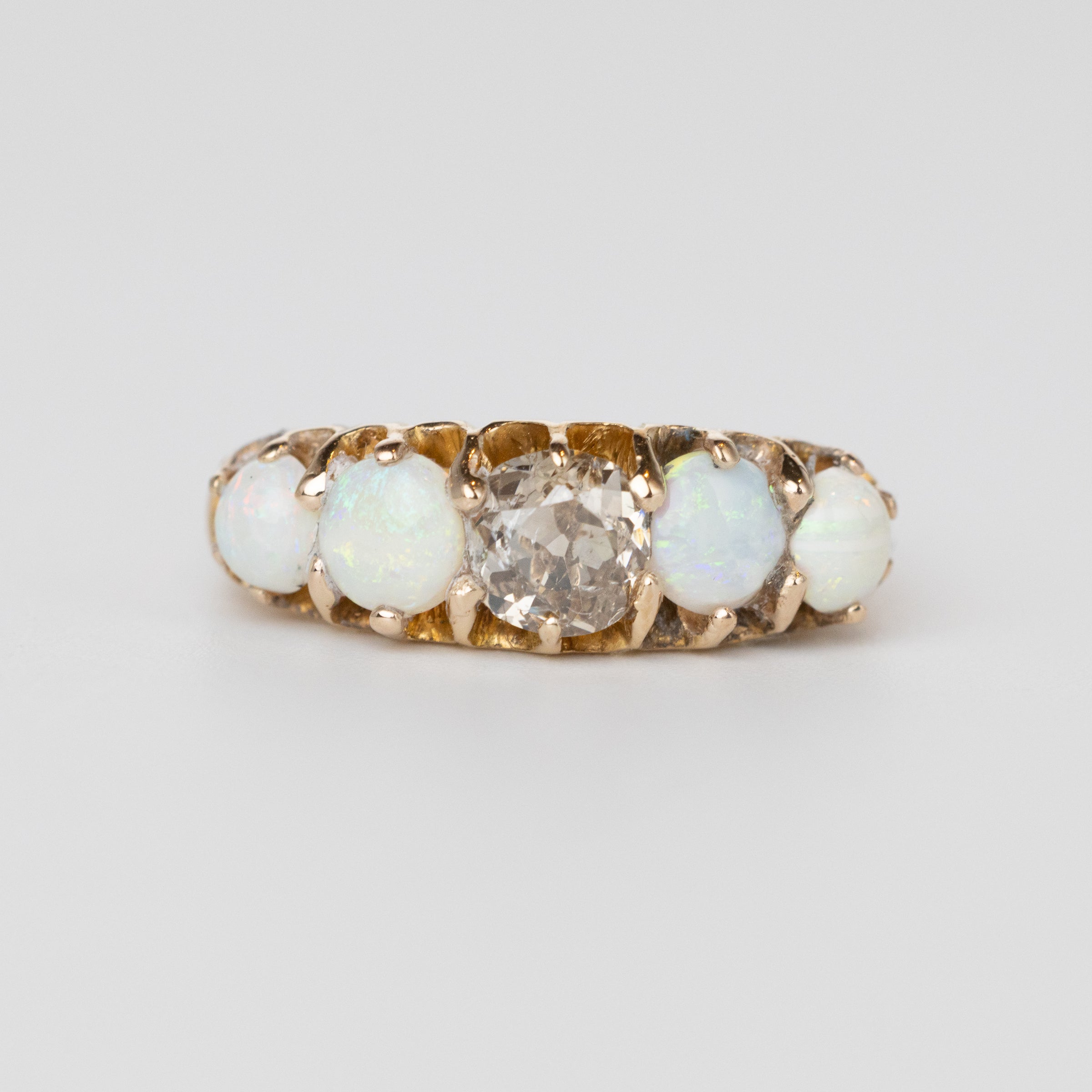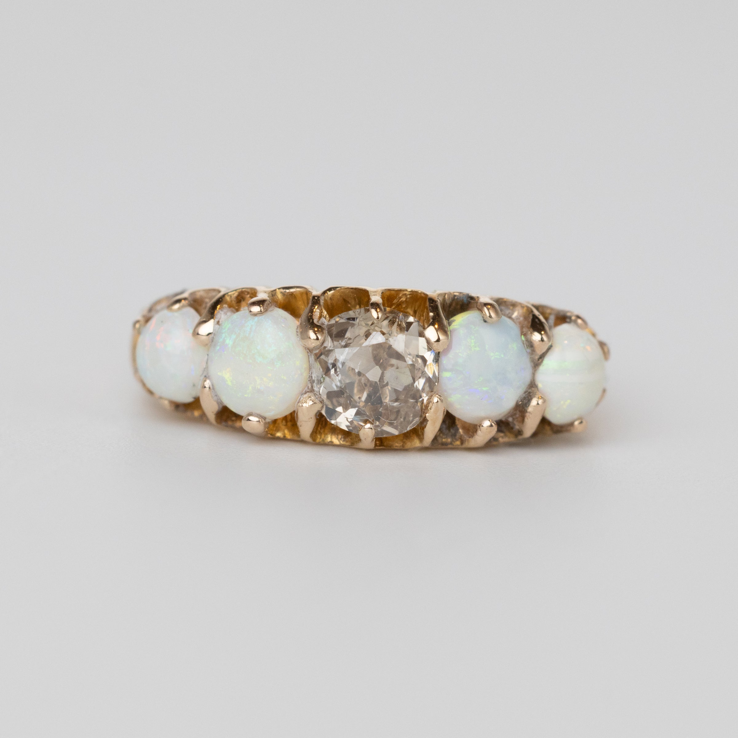 A gorgeous ring set in 18k yellow gold with 4 colourful opals and a sparkling mine cut diamond in the centre approximately 0.70 carats. Circa 1874