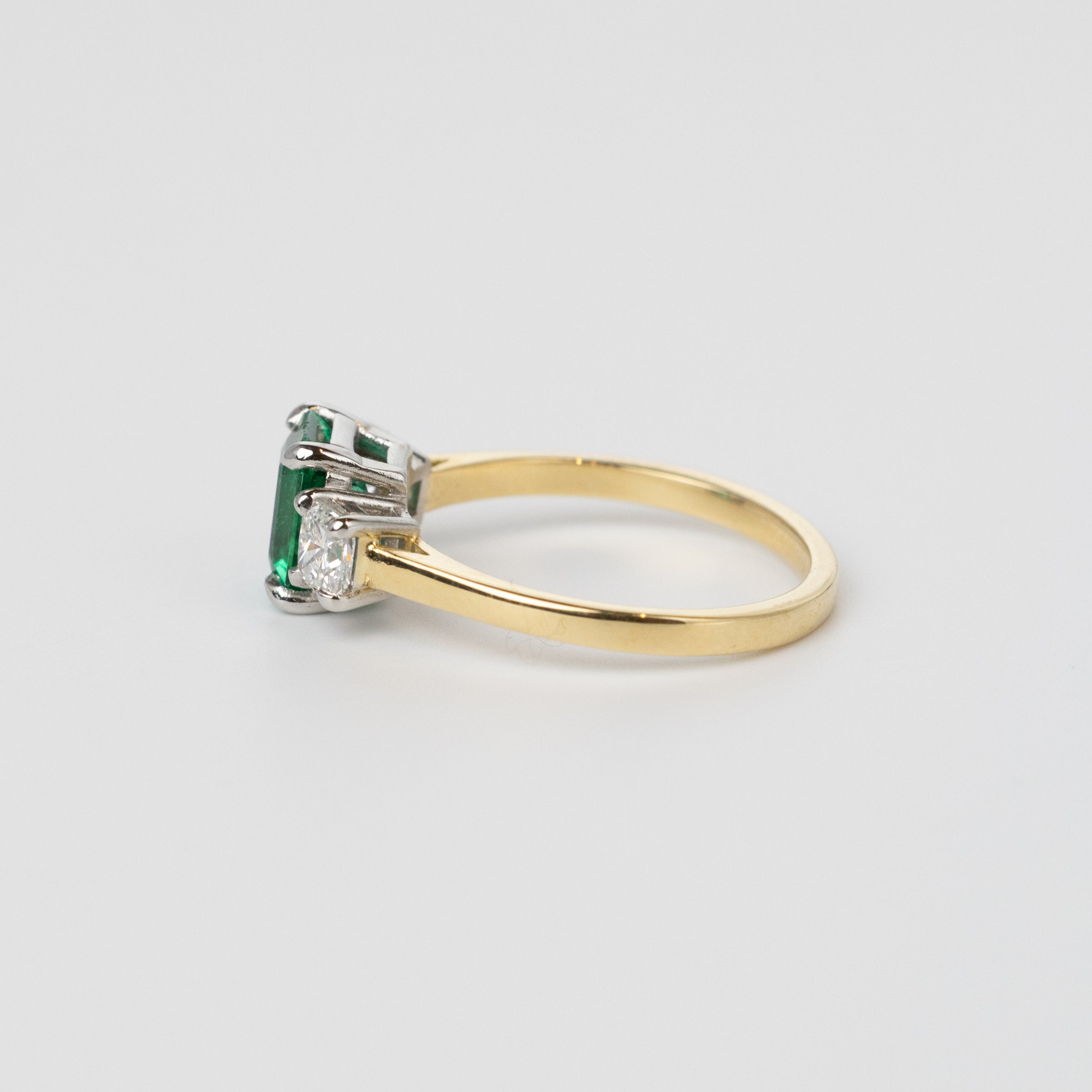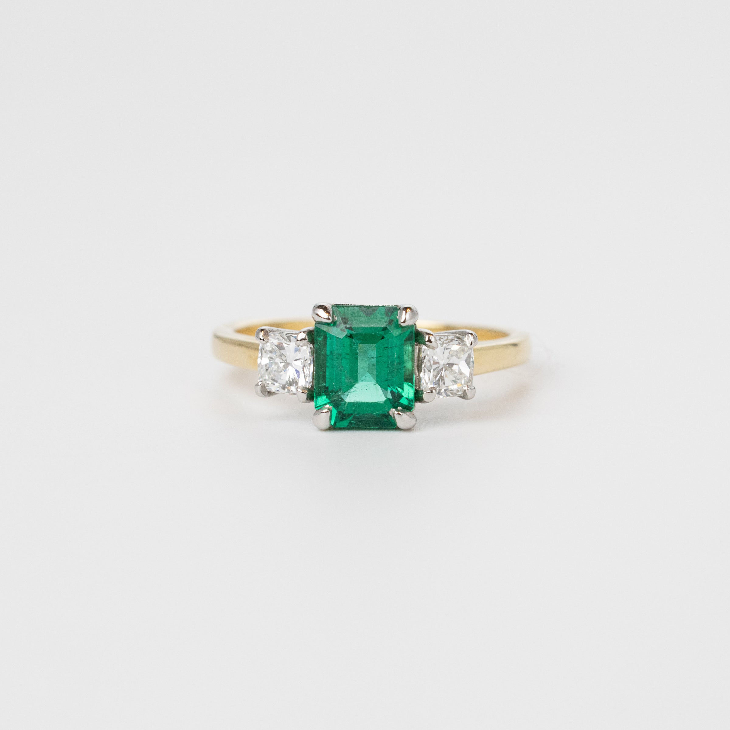 A gorgeous ring featuring a 1.45 carat zambian emerald with minor oil treatment (F1) with 2 cushion cut diamonds eitherside.