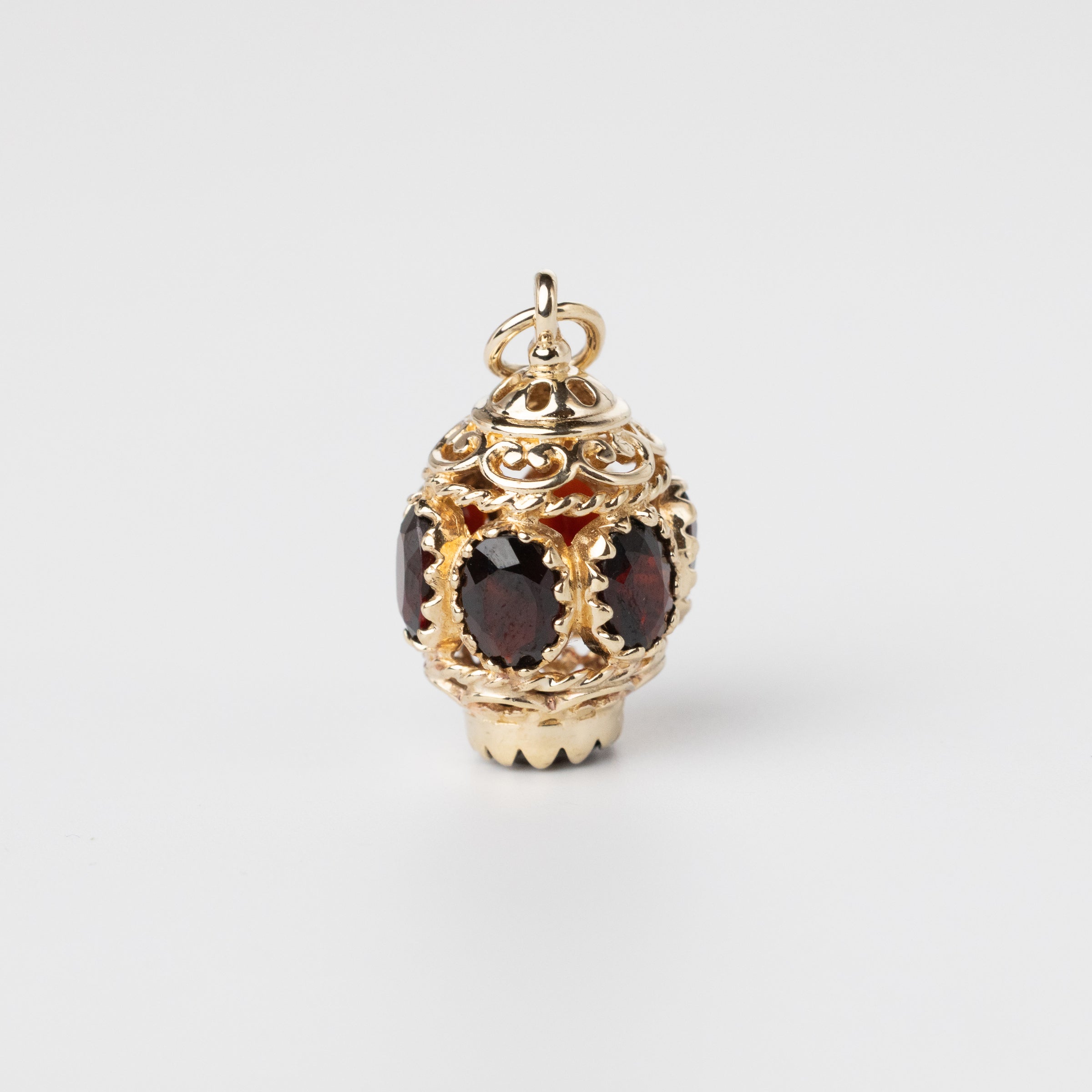 A beautiful vintage garnet charm set in intricate 9k gold, designed with openwork filigree and deep red gemstones.